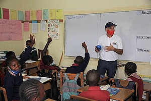 Our Country Representative and Senior Advisor teaching students about the benefits of saving during Financial Literacy Week at Rafiki Private School in Chongwe.